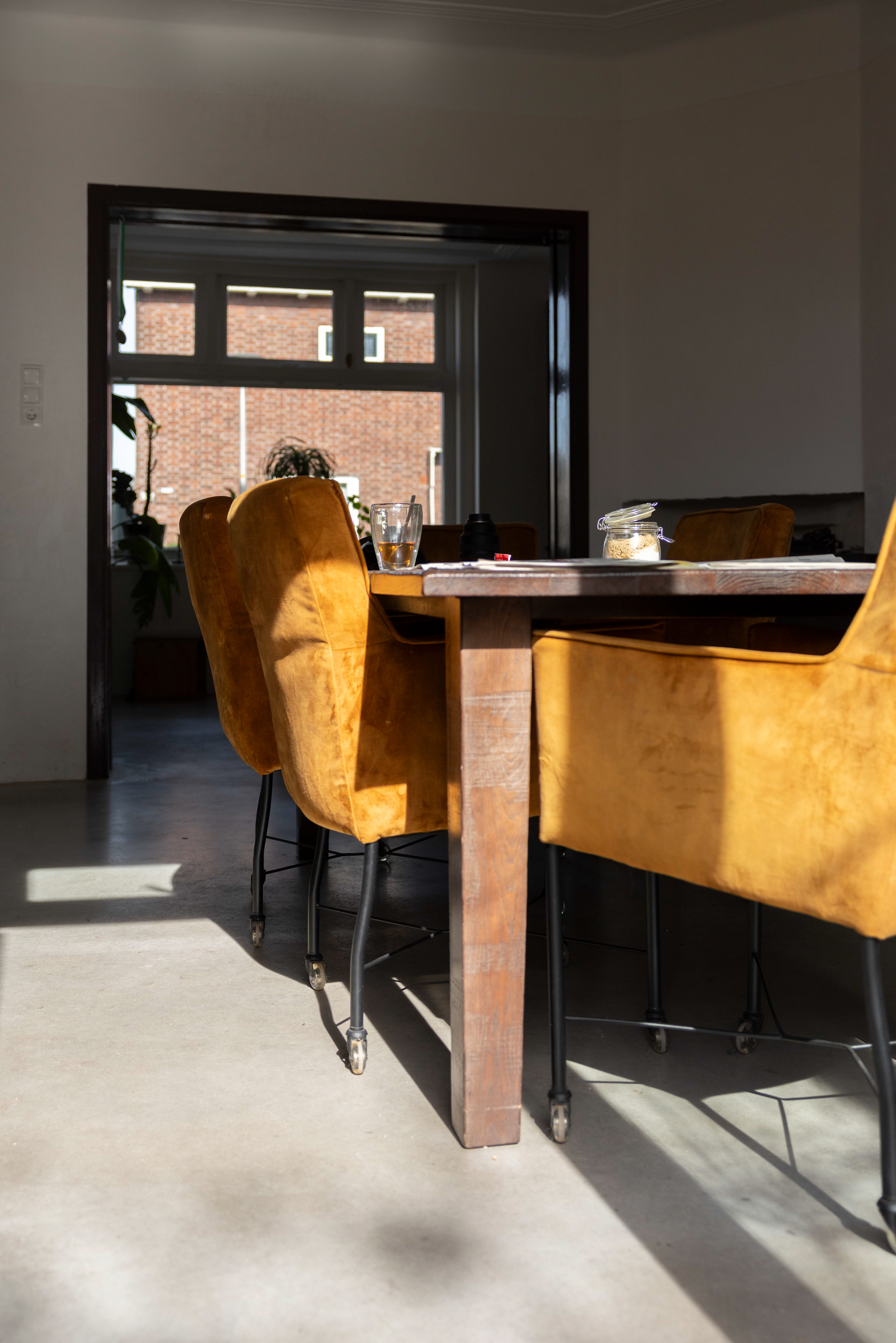 Zonlicht op de strakke betonvloer met vloerverwarming. Helaas van het glas in lood.