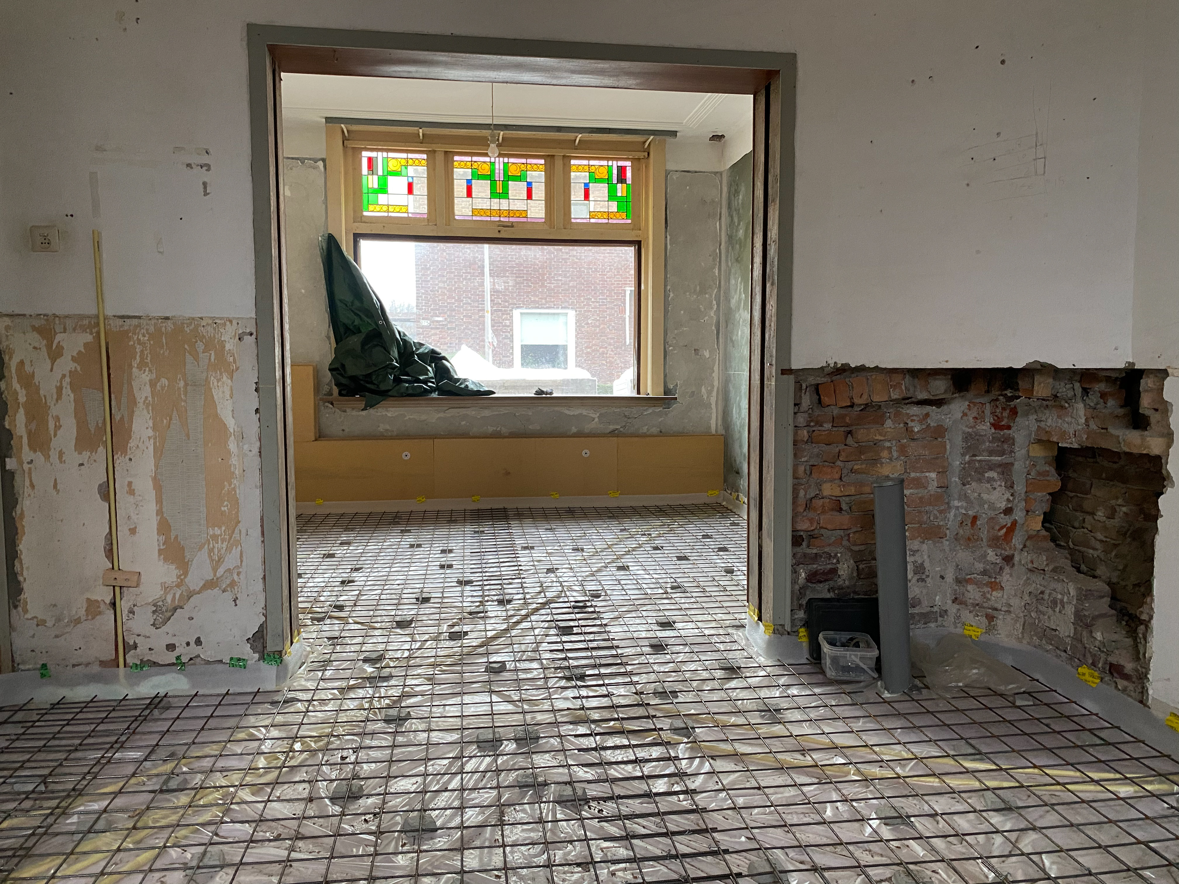 De start van de renovatie: gevelisolatie, nieuwe elektra, een geïsoleerde vloer met vloerverwarming én lucht voor de kachel.